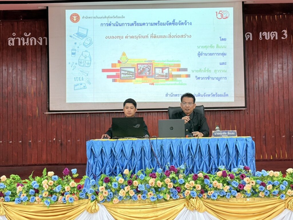 นางสาววันวิสาข์ พวงมาลัย ผู้ตรวจเงินแผ่นดิน (สตภ.7) มอบหมายให้นายศุภชัย สีแนน ตำแหน่ง ผู้อำนวยการกลุ่มและนายศักดิ์ชัย สุวรรณ ตำแหน่ง วิศวกรชำนาญการ ข้าราชการสำนักตรวจเงินแผ่นดินจังหวัดร้อยเอ็ด เป็นวิทยากรบรรยาย ในการประชุมเชิงปฏิบัติการการดำเนินการจัดซื้อจัดจ้างงบลงทุน ค่าครุภัณฑ์ที่ดินและสิ่งก่อสร้าง เพื่อสร้างความรู้ความเข้าใจให้กับข้าราชการครูและบุคลากรในสังกัดสำนักงานเขตพื้นที่การศึกษาประถมศึกษาร้อยเอ็ด เขต 3 เพื่อเป็นแนวทางในการปฏิบัติงานได้ถูกต้องตามกฎหมาย ระเบียบ ข้อบังคับ ในวันที่ 10 พฤศจิกายน 2568 ณ ห้องประชุมอาคารเอนกประสงค์ 206/26 สำนักงานเขตพื้นที่การศึกษาประถมศึกษาร้อยเอ็ด เขต 3 อำเภอโพนทอง จังหวัดร้อยเอ็ด